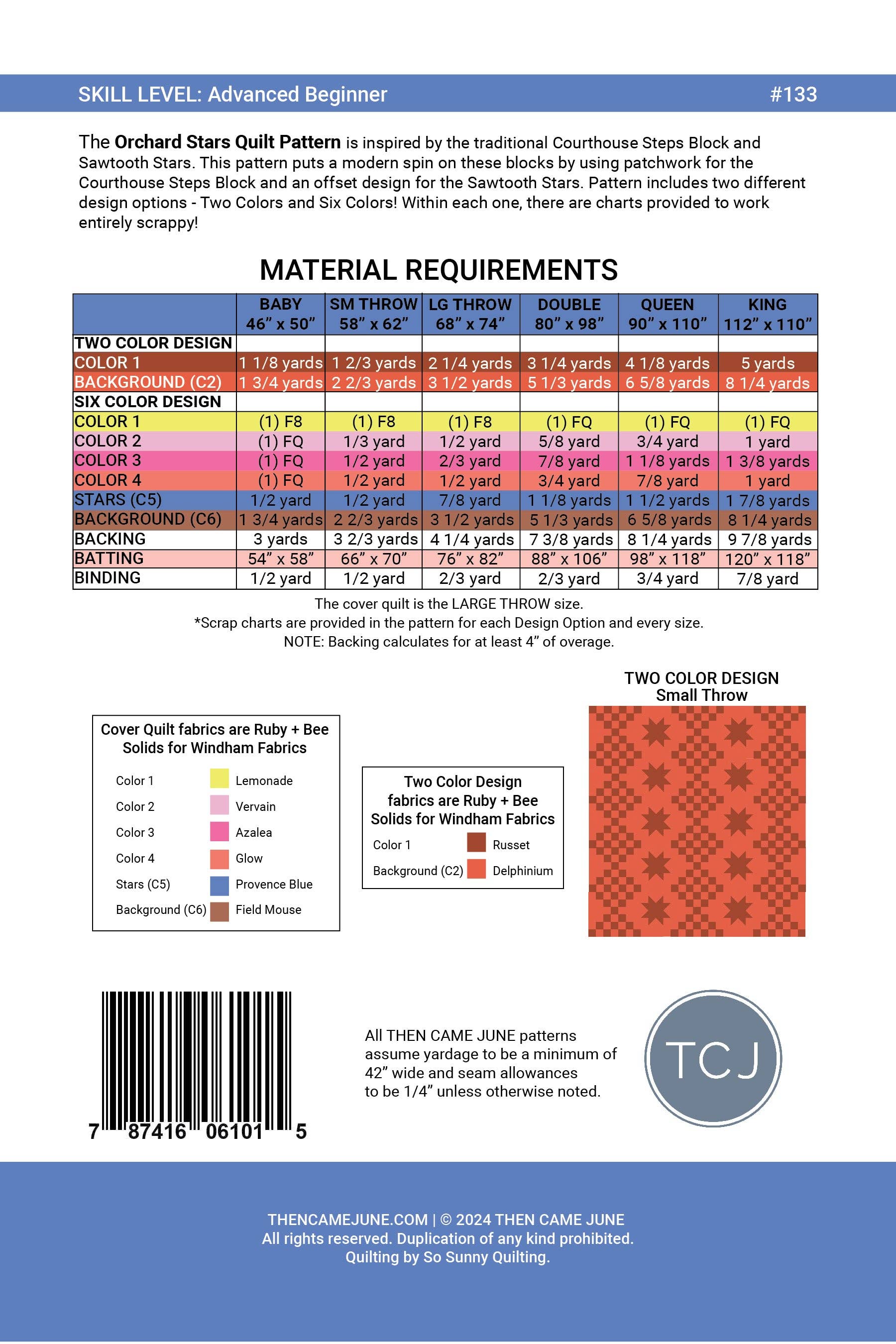 The Orchard Stars Quilt Pattern by Meghan Buchanan of Then Came June. The Orchard Stars Quilt Pattern is inspired by the traditional Courthouse Steps Block and Sawtooth Stars. This pattern puts a modern spin on these blocks by using patchwork for the Courthouse Steps Block and an offset design for the Sawtooth Stars. Pattern includes two different design options - Two Colors and Six Colors! Within each one, there are charts provided to work entirely scrappy! This pattern requires advanced beginner quilting knowledge. The pattern assumes quilter has knowledge of basic piecing and can use consistent 1/4" seam allowances. The pattern requires yardage or scraps.